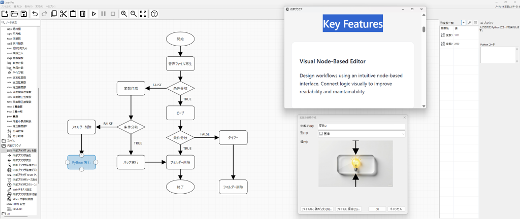 | 0.0.0.72 (beta) | 2025/05/15 | ・JavaScript 実行ノードを追加 ・内部ブラウザに HTML を設定するノードを追加 ・複数行テキストのプロパティ項目に変数を設定可能に ・その他の軽微なバグ修正 |